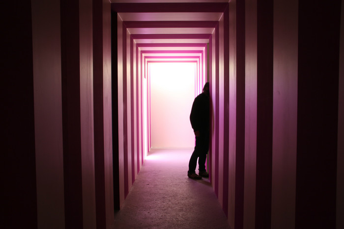 Rodney LaTourelle, In the Absence of Unambiguous Criteria, 2007 For his show at Program Berlin-based Canadian artist Rodney LaTourelle created one of his so-called walk-in paintings, a site-specific installation he has created in a number of cities internationally. Occupying two-thirds of the venue’s store-front exhibition space, the maze-like structure came complete with ceilings and three small, all but hidden, vestibules with a built-in seat that was big enough for one person. Leaving the construction’s steel studs visible on the outside like the frame on the back of a canvas, visitors to the exhibition could navigate the work’s three interconnecting hallways, each one painted with alternating bands of colour; of three sets in all, these vertical stripes comprised the work’s fictive dimension. Using natural light from the venue’s exterior windows, which the structure abutted, and ceiling-mounted florescent lights at each section’s opposite end, LaTourelle created the tactile conditions for shifting perceptions of colour, light and self…