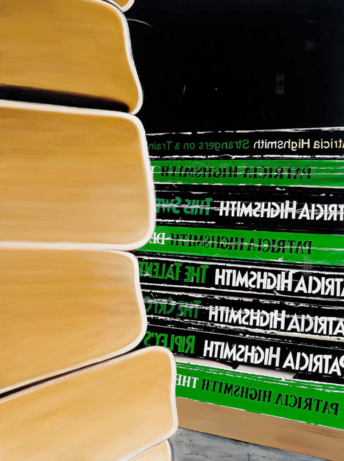 It is possible Phillips’s work flies beyond the sightlines of full art-world appreciation in Canada because he makes art in a fashion that is deceptively straightforward. His work is plainspoken in a way that is perhaps more intelligible to the European eye. Phillips hews a vernacular style that constructs a world from the materials at hand, as evidenced by his habit of making paintings about books he has read. One Month of Reading in the Mirror (2007), for instance, presents a stack of books by the writer Patricia Highsmith, their spines cracked from use. Not surprisingly, Phillips, a maker of paintings, gives his literary references a surface form. He presents books to be judged by their covers, so to speak. For an exegesis of their references, viewers will need to look elsewhere—including to other works made by the artist.