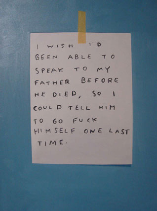 The implied deferral of significance between works is the method by which Phillips constructs an edifice of meaning through his practice as a whole, his titling of a work being a pointed element within the piece’s overall composition. This is especially true because his work is always figurative with a focus on the still life (Sentimental Monochrome, 2009) or landscape (Summer of Whatever, 2003), and he has made many paintings in which the signifying element is reduced down to a declarative text. The work Richard Prince (2009), for instance, is a painting of a piece of paper taped to a wall, with a note scribbled on it that reads like a one-liner from Prince’s own Joke series (1986–ongoing): “I wish I’d been able to speak to my father before he died, so I could tell him to go fuck himself one last time.”