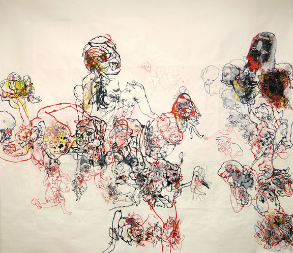 The expressive potential of the figure is powerfully put to use in Toonoo and Pien’s work. Toonoo presents stone carvings, embellished with detailing – of a fur fringe on a hood or a face, sometimes a skull, carved in bone. Each carving tells a story, often tragic. Pien’s drawings are created through a process he calls monoprinting. Taking quickly drawn sketches in coloured ink, he creates overlapping compositions with the wet ink applied to fresh paper, often placed on top of other drawings, or cut out and collaged together. Combined into large densely layered composite pictures, the effect is mesmerizing.