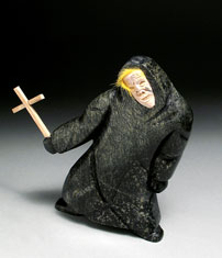 By strictly adhering to the elements of line and color, but at the expense of volume, Pien creates drawings that look stencil-like, and further evoke the ancient art of Chinese brush drawing. Pien is an Asian-Canadian who immigrated to Canada from Taiwan at the age of 11. While reminiscent of Chinese art traditions, the artist reports he developed the monoprinting process in the course of his art practice. The technique is entirely his own. Born into a family of artists, Toonoo has deep roots in the artmaking traditions of his people. He adds embellishments to traditional-looking stone carvings, such as a figure brandishing a wooden hockey stick, or cross hung around the neck of a hooded figure, to clearly place his work in the contemporary world. Detailing allows Toonoo to align obdurate stone and Inuit carving techniques with drawing, and drawing’s aptitude for editorial commentary.
