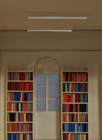 The world of Enclosed is not real but does exist within the real world of film. By creating a space for the purpose of filming it, the artists concede to practicalities. However heroic the effort, making art is certainly less arduous than making architecture—and serves a different purpose. In the construction of each maquette, fidelity to detail translates into the indeterminate scale of filmic space. Miniature-ness does not necessarily matter when filmic illusion sets in; it simply becomes the volume that defines the space in the film. By shooting the maquettes and editing all views into one homogenous entity, the artists create an encompassing view. However, the continuous motion within the film, and of the film itself, prevents close looking. The illusion is protected from scrutiny and so further perpetuated. This is true even though Enclosed is presented as two films on a split screen, each providing slightly different views of the library construct.